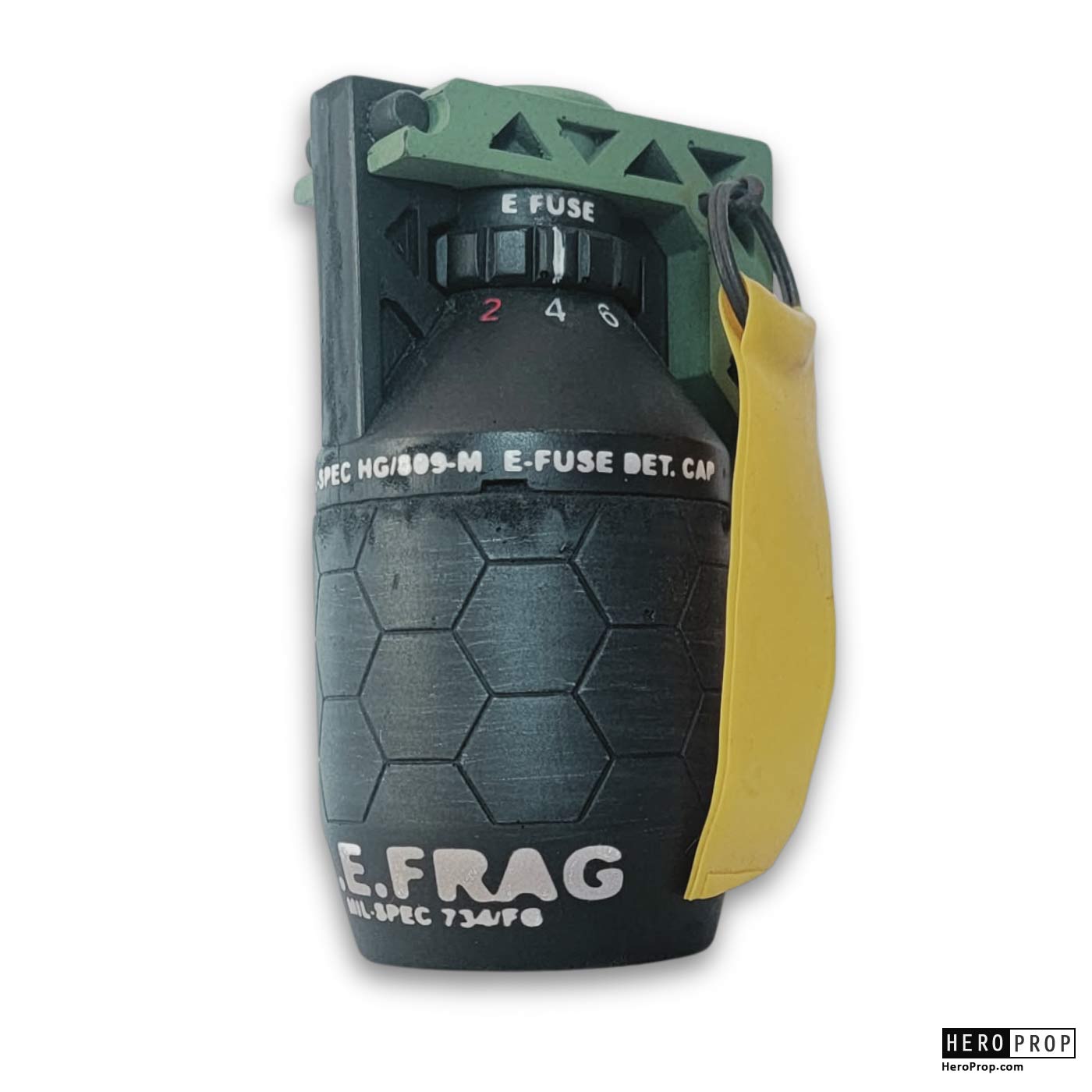 This is a handheld explosive device issued to RDA soldiers and features a delayed fuse with a flip open top section. These were used by the soldiers during their attack on Pandora and can clearly be seen being used by Jake Sully to take down the Valkyrie when it attacks the Tree of Souls. This piece is made of a dense urethane with a rounded main body with applied white letter decals. The top section is green in color and is held on via a metal cotter pin with an attached yellow silicone ribbon. This piece has been slightly weathered by the production to appear aged and features some small scapes and scuffs from use in the film. This item remains in excellent, production used condition.