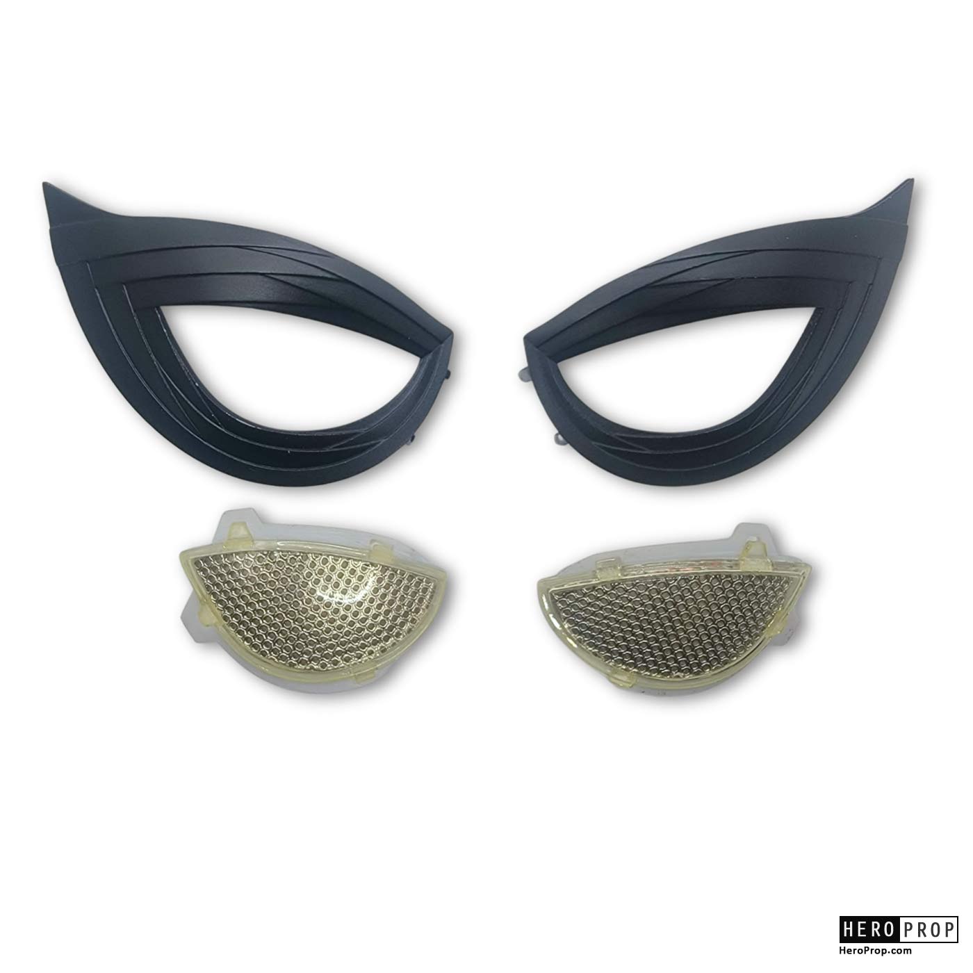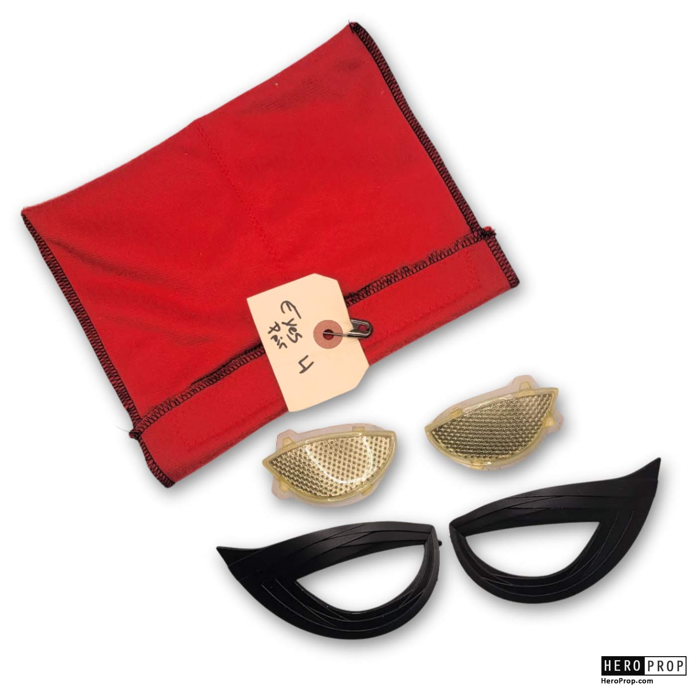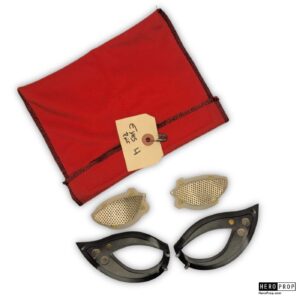 Spider-Man suit eye lenses and frames from the film in which Tom Holland makes his debut as Spidery in Captain America: Civil War. With his introduction into the MCU, Spiderman, actor Tom Holland adored the signature suit for the film. These frames were used on the suit worn by the actor and consists of two black printed frames with magnets on the back where they would attach to the actors suit. Included are two inner lenses that the actor would see through. These lenses would attach to the inside of the frames to complete the signature eye look of the character. Included is a red cloth bag used by the production to the keep the lenses and frames from getting scratched. Has a small break in the white lens under-frame but overall in very good production used condition.