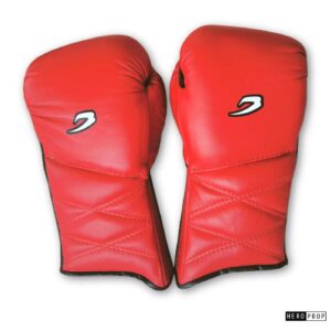 A pair of red and black leather BOXRAW Gurobu Kenka boxing gloves with black nylon laces with white and black vinyl branding. In excellent production used condition, but with fragile vinyl that is prone to coming off.