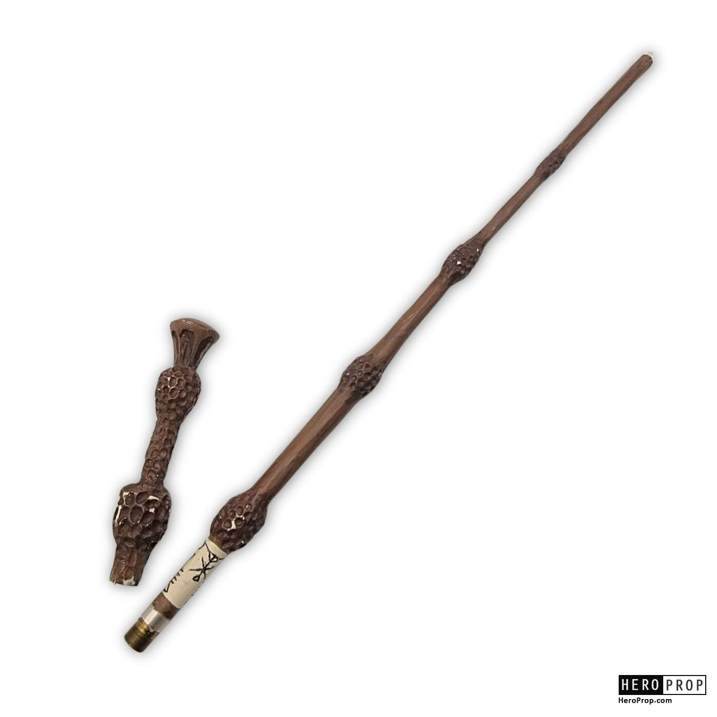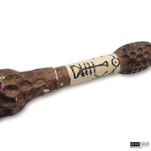 This wand is made of resin, hand-painted and finished to resemble natural wood. The wand also features a hand-painted white section with detailed ‘carved’ figures. This piece shows slight wear from use in the film such as small scratches and scuffs in the paint, but remains in excellent production used condition.