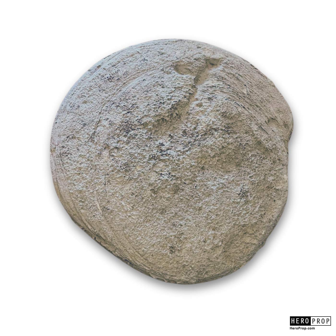 This prop is composed of a concrete-like material that has been shaped to appear like a large skipping stone. A series of striations are present throughout both surfaces and the outer ridge and measures approximately 8.5” (21.60cm) across.