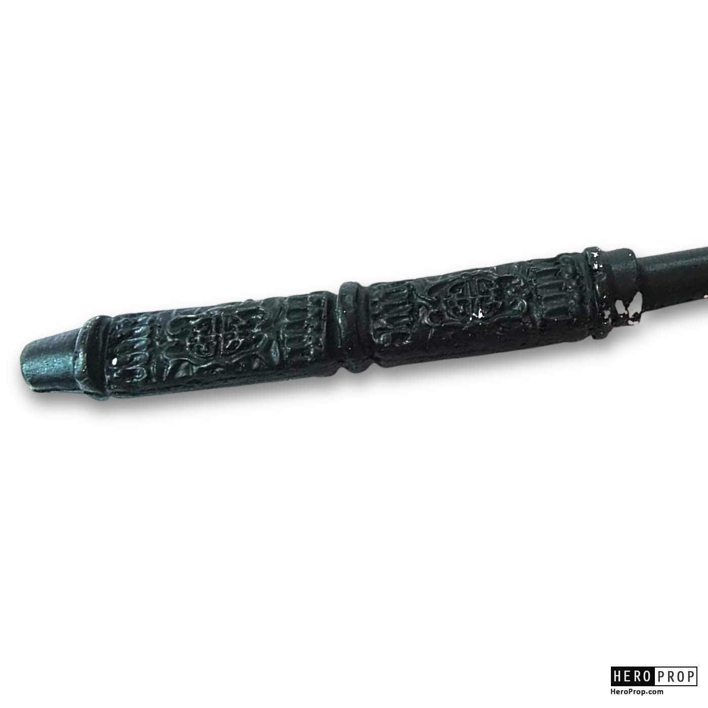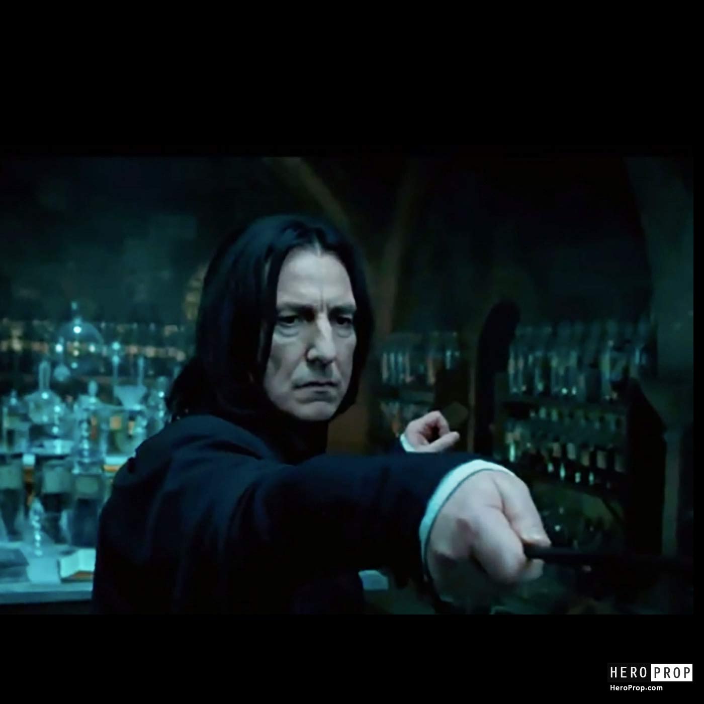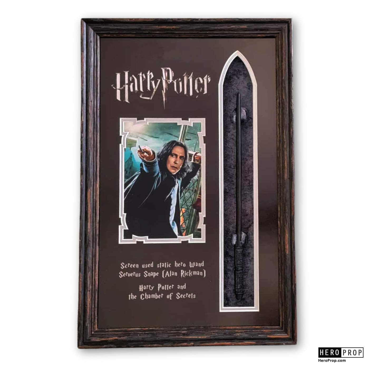 This wand was used by the character of Severus Snap, actor Alan Rickman throughout the series and features his signature wand style with a rune style handle section. The wand itself is made of resin and painted black in color, it features a smooth shaft and indented rune style handle. The wand comes framed in a museum quality custom display that features the character and images from the film. This piece shows slight wear from use in the films but remains in excellent, production used condition.