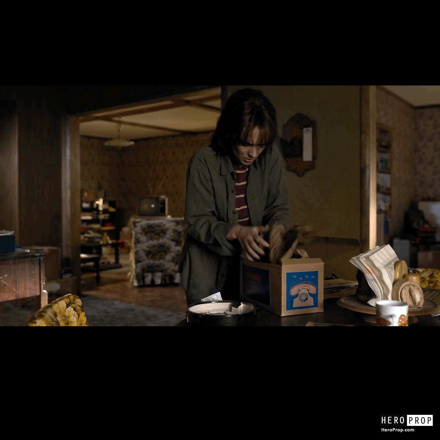 This phone box as seen being opened by Joyce Byers, actress Winona Ryder when she frantically purchases various phones in hopes of hearing from her lost son Will. This is a custom made vintage style phone box, made of cardboard, rectangular in shape and featuring custom designs on the outside of the box. This piece measures, and remains in excellent, production used condition.