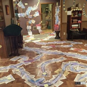 This episode we see Will (Noah Schnapp) struggling to describe his visions. keeps failing to put into words what he was experiencing, his mom (Winona Ryder) suggested “what if you didn’t have to use words”. Will then produces dozens of the line drawings, Hopper and Joyce initially thinking they are meaningless scribbles until Joyce realizes two of the drawings connect. They begin mapping out the connecting drawings, taping them all over the walls and floor to form an interconnected series. This was one of the drawings, an excellent piece in good production used condition and still retaining tape when it was used on set.